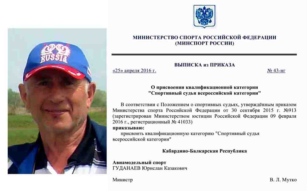Поздравляем ГУДАНАЕВА Юрислана Казаковича из Нальчика, Кабардино-Балкарской Республики с присвоением высокого звания "Спортивный судья Всероссийской категории" по авиамодельному спорту.