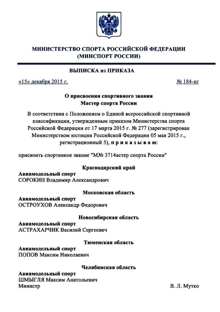 SIvanov писал(а):Поздравляем Сорокона Владимира с присвоением мастера спорта России. Желаем дальнейших успехов в спорте. Приказ 184-нг от 15.12.