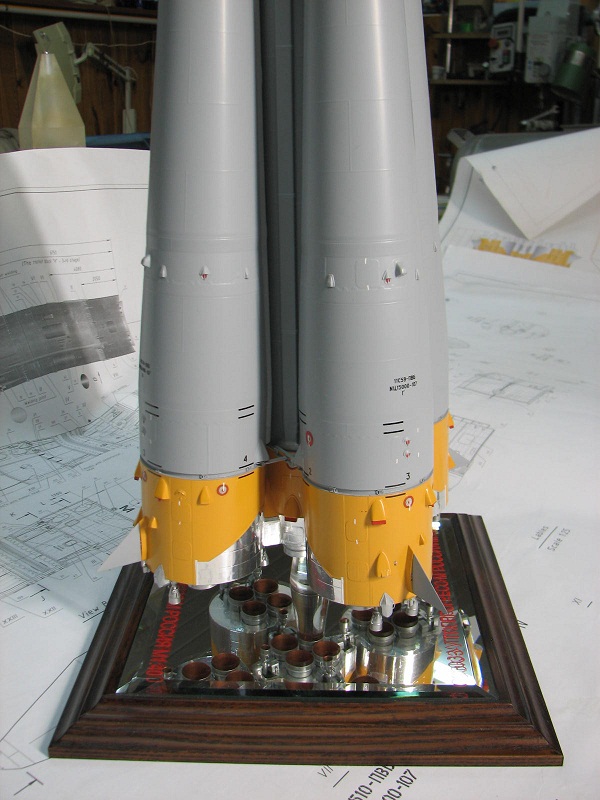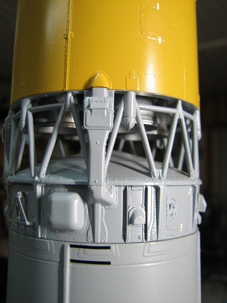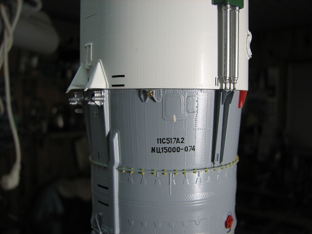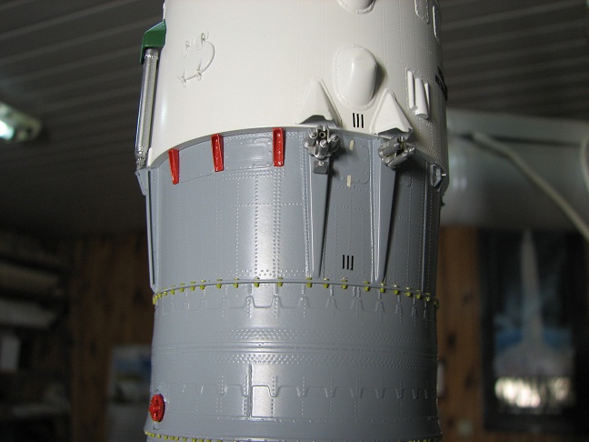 Ну, а как без "красноты"! На фотографиях она(краснота) есть, а фотография для копииста, как устав для новобранца! Тут ведь дело в чём? Можно обойтись и без красных чехлов и заглушек если знаешь, что под ними находится. И тут два варианта: если знаешь , что под заглушкой находится и можешь сделать , то как говориться "зубило или напильник вам в руки", но частенько под заглушкой(красной коробкой) находится такое , что желание воспроизвести Это сразу отпадает. Так что "краснуха" на модели это частенько халява моделиста. Хотя были и исключения у того же Анатолия Ивановича.. Он на своём "Союзе" делал красные дренажные бочки(кажется с силикагелем) и множество красных краников на днище 1-2 ступени, которые, конечно, можно было бы и не делать.