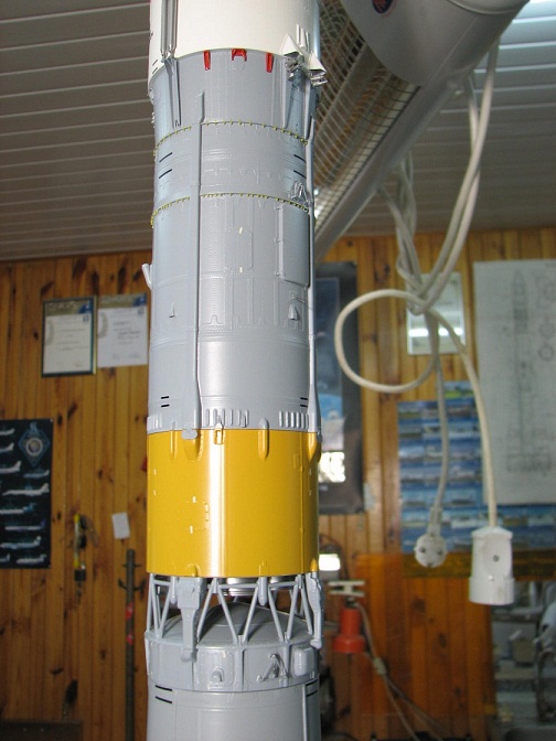Ну, а как без "красноты"! На фотографиях она(краснота) есть, а фотография для копииста, как устав для новобранца! Тут ведь дело в чём? Можно обойтись и без красных чехлов и заглушек если знаешь, что под ними находится. И тут два варианта: если знаешь , что под заглушкой находится и можешь сделать , то как говориться "зубило или напильник вам в руки", но частенько под заглушкой(красной коробкой) находится такое , что желание воспроизвести Это сразу отпадает. Так что "краснуха" на модели это частенько халява моделиста. Хотя были и исключения у того же Анатолия Ивановича.. Он на своём "Союзе" делал красные дренажные бочки(кажется с силикагелем) и множество красных краников на днище 1-2 ступени, которые, конечно, можно было бы и не делать.