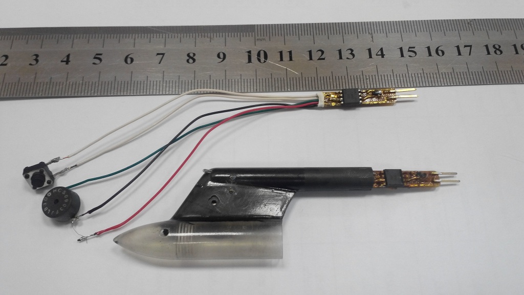 размер платка 23х6 мм вес 0,8-0,9г.Питание от 1 липольки(силовой)надо нагревать нитку нихрома.Я пока использую батарейка 90ма/ч Покупаю на хобикинге Вес тяжеловат-2,7-2,9 грамма,но он чудненько входит в фюзеляж D-7мм.Для блудов и парашютов полно акку для микровертолётов.фото прилагаю.
