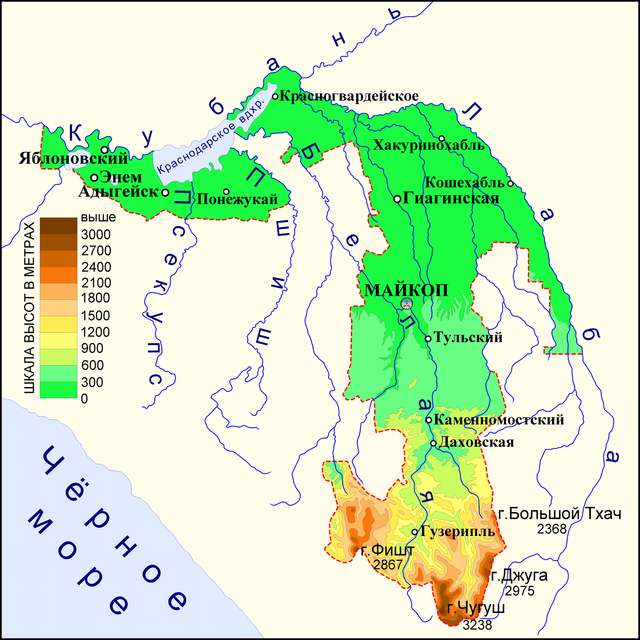 Столица — город Майкоп. Территория республики окружена территорией Краснодарского края.