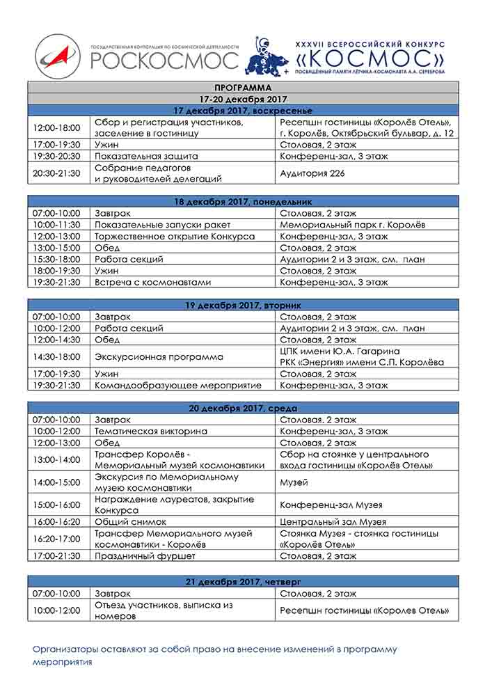 II этап – федеральный (очный финал): 18-20 декабря 2017 года (включительно; защита работ проводится на научно-технической конференции по тематическим секциям) в городе Королёв Московской области. Место проведения финала: Московская область, г. Королёв, Октябрьский бульвар, д.12.