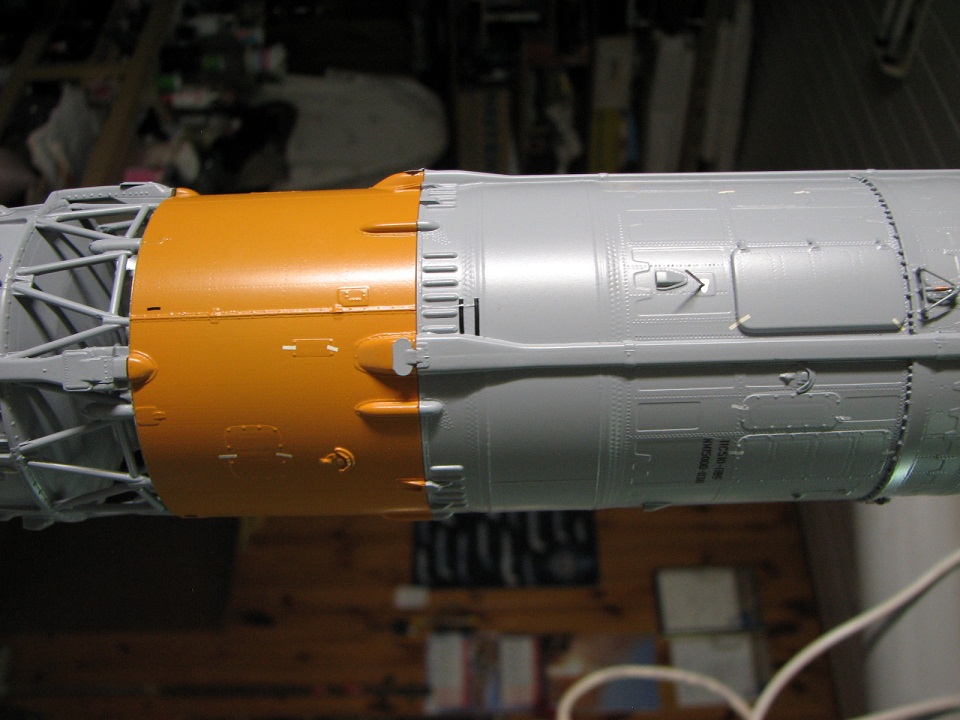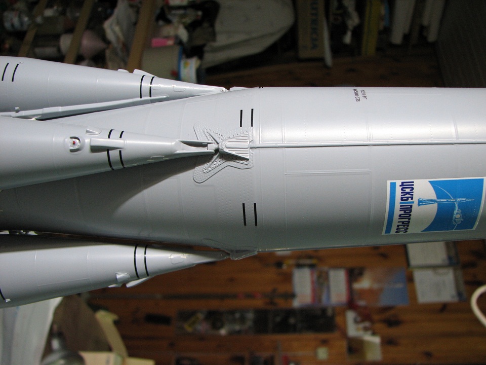 Да , действительно на модели двигательный отсек блока "И"не разделяется на секции( по причине , что двигательная юбка является силовой часть конструкции модели), НО!...... а в этом во общим то вся собака зарыты!....... в полёте на высоте 75-100 м , при отделении блока "И" от ЦБ (запуск 2 ступени) из свободного объёма вываливаются три отсека)полностью аналогичные внешнему виду двигательного отсека блока "И". Копийность полета по прототипу соблюдена!