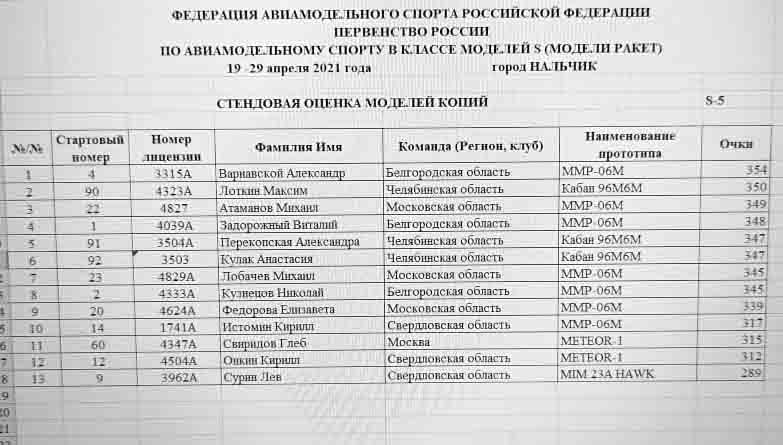 Самым успешным для команды оказался класс S-5А (модели-копии на высоту полёта). Модель Сергея Коноплёва, взлетевшая на высоту 674,2 метра, принесла серебряную медаль спортсмену, а сумма удачных полётов других участников вывела Краснодарский край на третье место в командном зачёте.